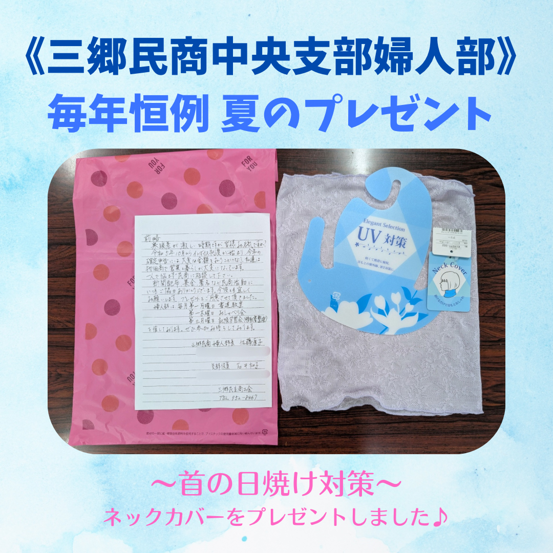中央支部の婦人部では、毎年7月頃に部員へのプレゼントをおこない、いつも大変喜ばれています。今年のプレゼントは涼しげな『ネックカバー』です。